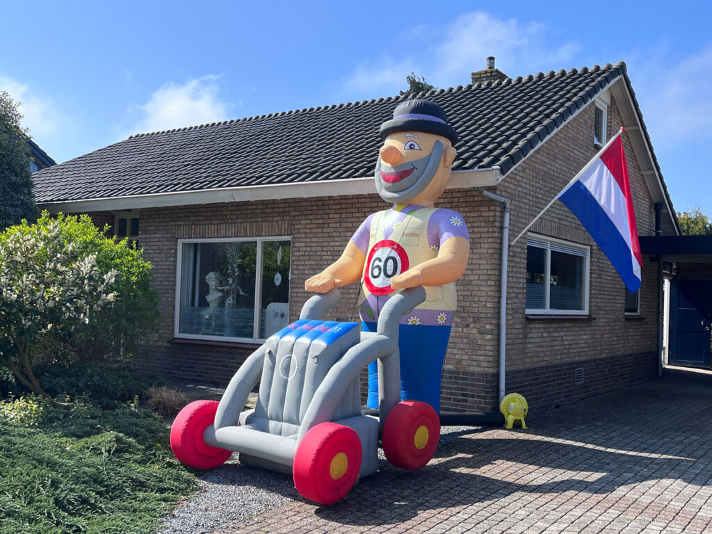 Abraham en Sarah te huur met gewenste leeftijdsbadge (4,5 meter hoog)! Alle leeftijden mogelijk! Opzetten is in een paar minuten geregeld. De opblaaspop is makkelijk mee te nemen in de auto. Inclusief blower, verankeringsmateriaal en handleiding. De voordelen van het huren van een opblaaspop bij Frieswijk verhuur op een rijtje: